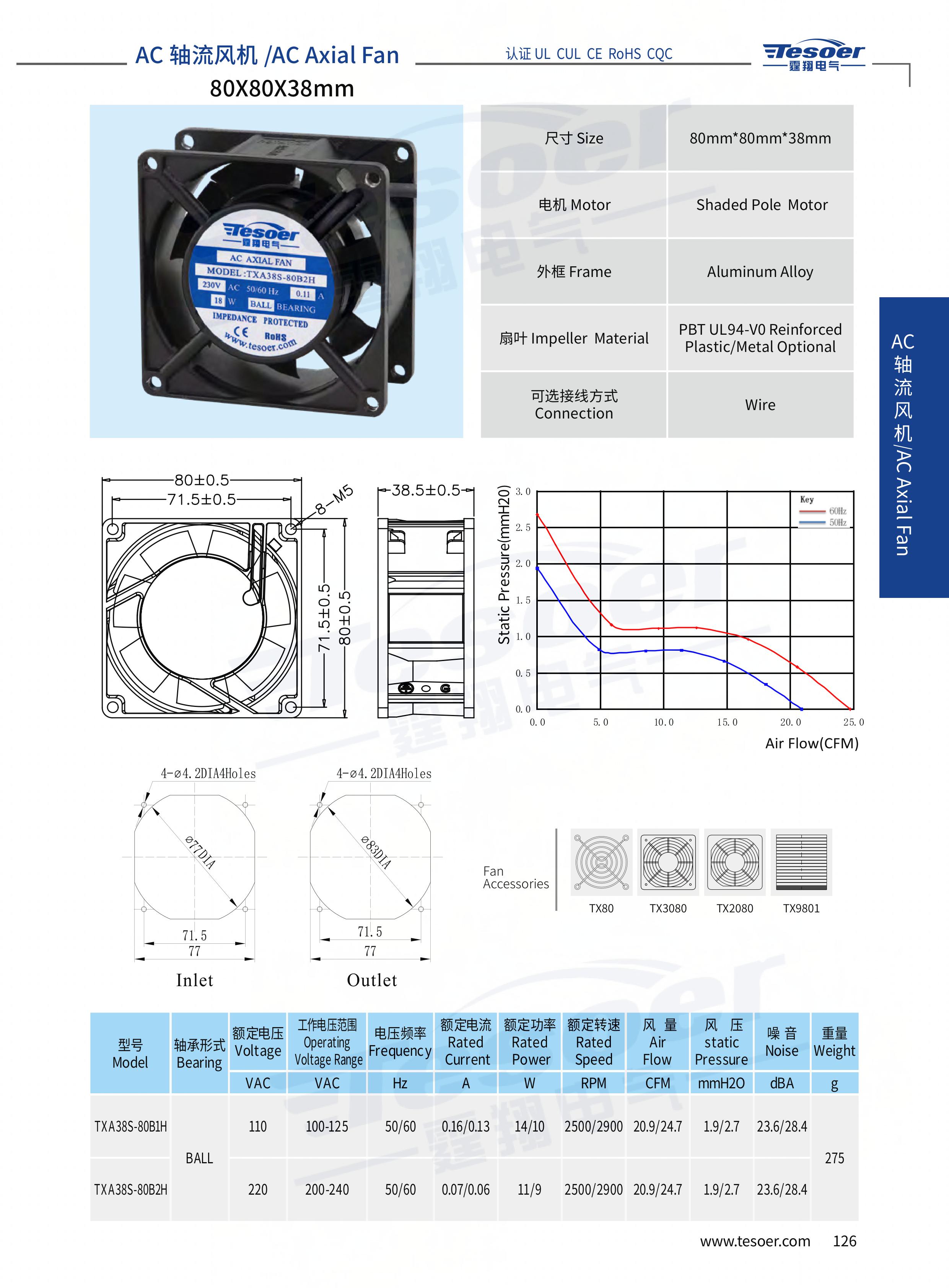 扇葉:PBT UL94-V0 Reinforced Plastic/Metal Optional