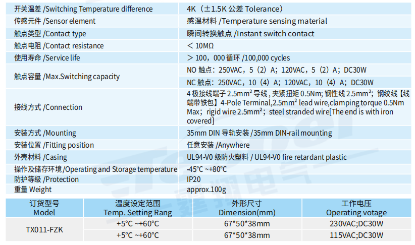 常開型溫控器采用貴金屬溫感材料作為動作觸點,當環境 溫度超出設定值時,觸點動作,閉合電路用于啟動風扇或者信號裝置。