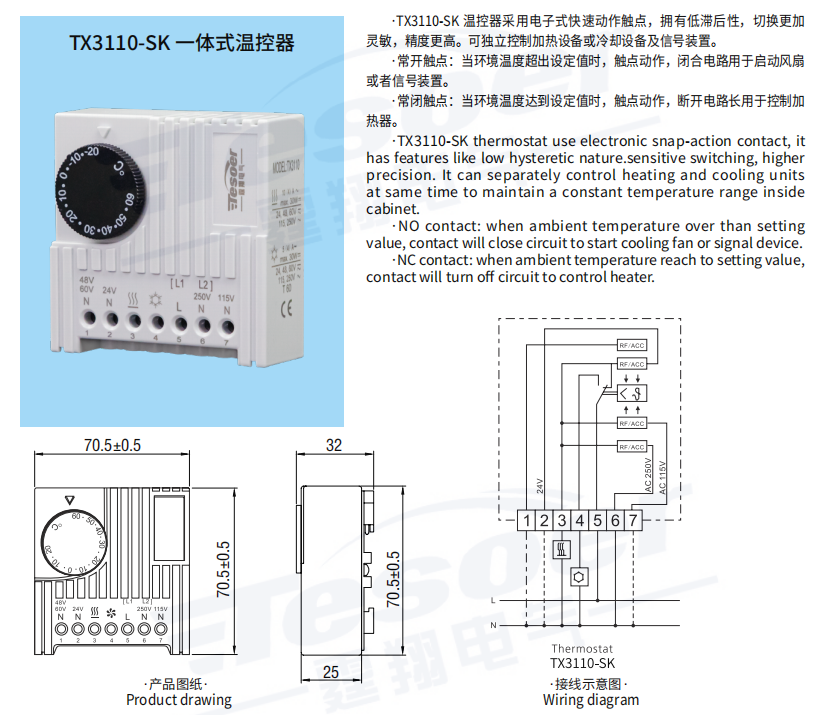 當溫度超出設定值時,開關裝置可以啟動風機、信號裝置或者是加熱器,普遍用于電力柜、成套柜、直流充電樁等各類型的機柜環境。