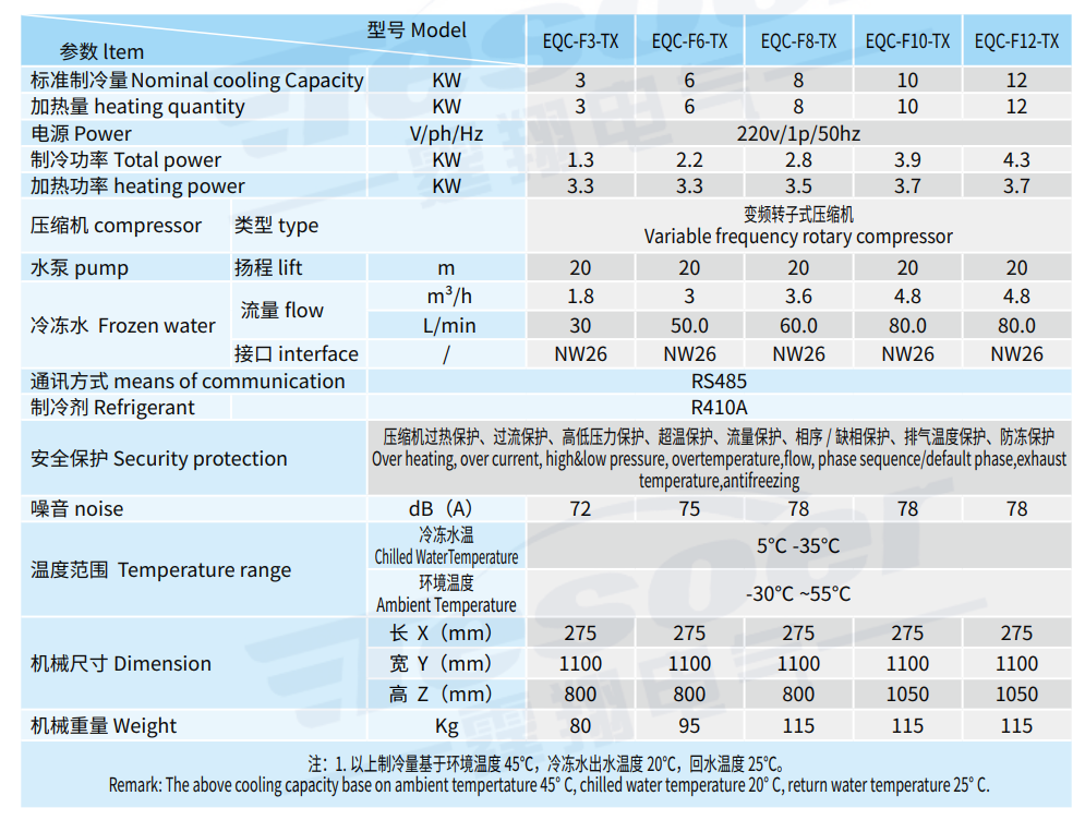 注:制冷量基于環境溫度 45℃,冷凍水出水溫度 20℃,回水溫度 25℃